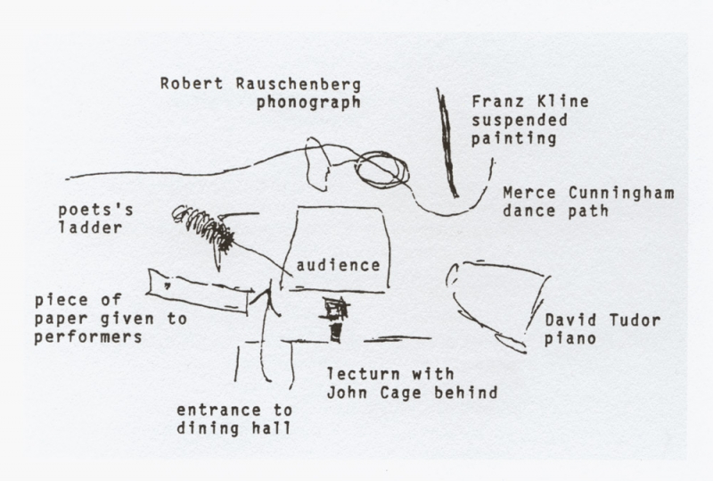 M.C. Richards, floor plan of John Cage’s Theater Piece No. 1 (1952), drawn for William Fetterman in 1989. Source: https://www.icaboston.org/events/theater-piece-no-1-x-50-theater-piece-no-1-revisited